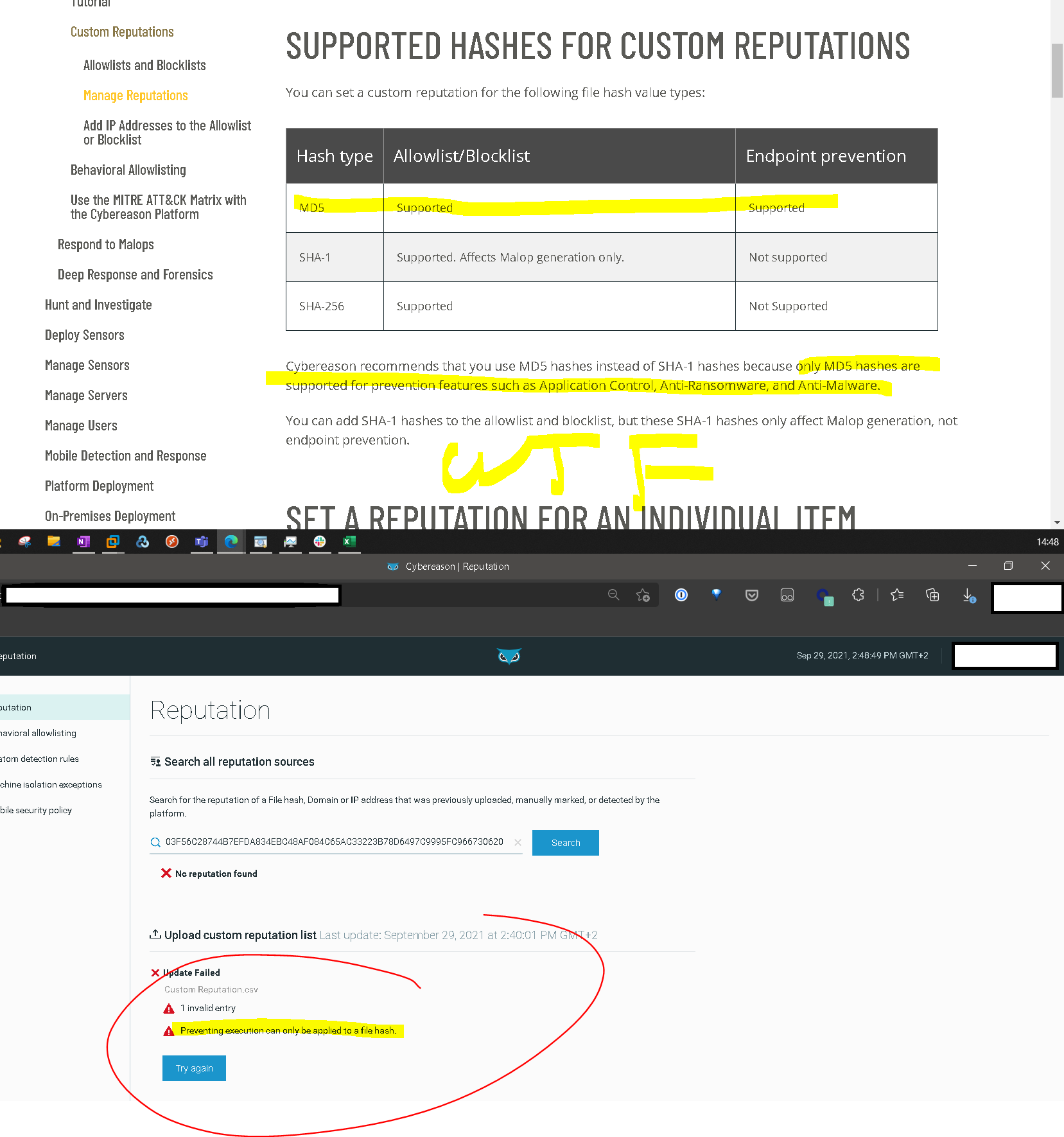 - as below screenshots, md5 hashes are premiered as the platform is built around it. Using or expecting to use sha1/sha256 (where the industry is quickly moving to sha256 in alot of edr products) is basically a no-go as you cannot manage the edr prevention actions and perform actions on sha256 hashes (WTFvck!) (like really, wtf!)